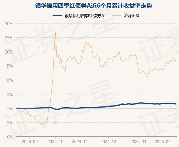证券之星消息,2月19日,银华信用四季红债券A最新单位净值为1.0884元,累计净值为1.6304元,较前一交易日上涨0.03%。历史数据显示该基金近1个月上涨0.02%,近3个月上涨1.23%,近6个月上涨1.55%,近1年上涨3.8%。该基金近6个月的累计收益率走势如下图: