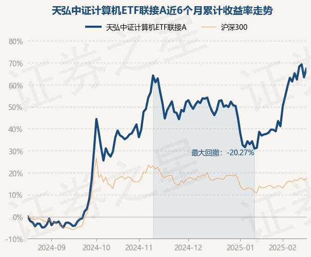 证券之星消息,2月19日,天弘中证计算机ETF联接A最新单位净值为0.8443元,累计净值为0.8443元,较前一交易日上涨2.41%。历史数据显示该基金近1个月上涨21.57%,近3个月上涨12.66%,近6个月上涨67.29%,近1年上涨44.28%。该基金近6个月的累计收益率走势如下图: