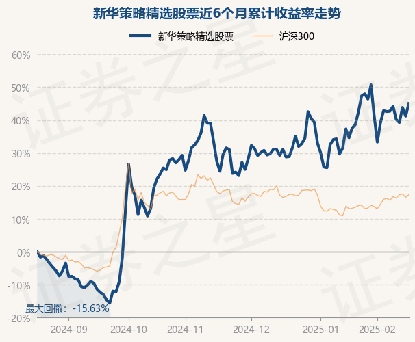 证券之星消息,2月19日,新华策略精选股票最新单位净值为1.3963元,累计净值为1.8343元,较前一交易日上涨2.71%。历史数据显示该基金近1个月上涨4.63%,近3个月上涨11.91%,近6个月上涨45.02%,近1年上涨32.25%。该基金近6个月的累计收益率走势如下图:
