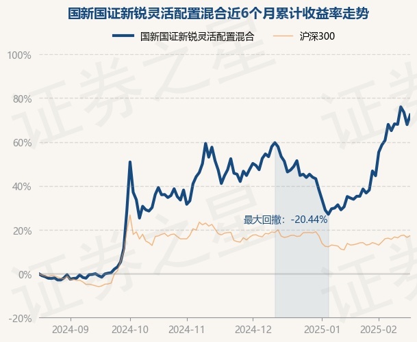 证券之星消息,2月19日,国新国证新锐灵活配置混合最新单位净值为1.51元,累计净值为1.51元,较前一交易日上涨2.65%。历史数据显示该基金近1个月上涨27.43%,近3个月上涨19.18%,近6个月上涨72.37%,近1年上涨48.62%。该基金近6个月的累计收益率走势如下图: