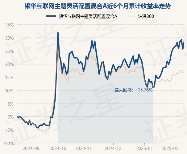 证券之星消息,2月19日,银华互联网主题灵活配置混合A最新单位净值为1.416元,累计净值为1.416元,较前一交易日上涨2.24%。历史数据显示该基金近1个月上涨11.41%,近3个月上涨8.34%,近6个月上涨28.49%,近1年上涨20.0%。该基金近6个月的累计收益率走势如下图: