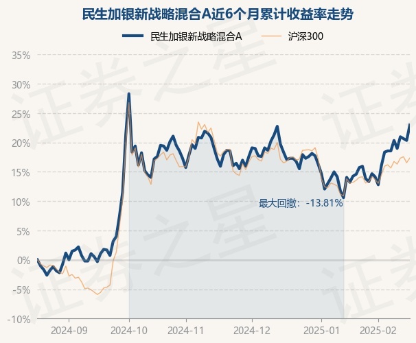 证券之星消息,2月19日,民生加银新战略混合A最新单位净值为1.173元,累计净值为1.3元,较前一交易日上涨2.18%。历史数据显示该基金近1个月上涨7.32%,近3个月上涨4.27%,近6个月上涨22.96%,近1年上涨31.06%。该基金近6个月的累计收益率走势如下图: