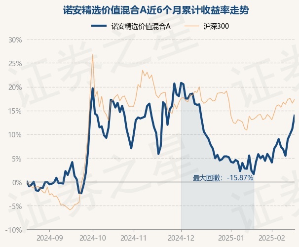 证券之星消息,2月19日,诺安精选价值混合A最新单位净值为1.0602元,累计净值为1.0602元,较前一交易日上涨2.54%。历史数据显示该基金近1个月上涨9.33%,近3个月上涨6.0%,近6个月上涨13.93%,近1年上涨18.08%。该基金近6个月的累计收益率走势如下图: