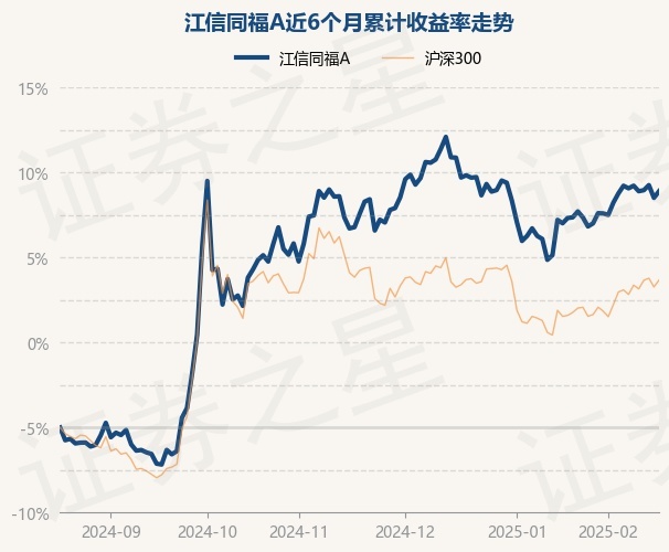 证券之星消息,2月19日,江信同福A最新单位净值为1.5013元,累计净值为1.5398元,较前一交易日上涨0.62%。历史数据显示该基金近1个月上涨2.46%,近3个月上涨2.15%,近6个月上涨27.8%,近1年上涨16.27%。该基金近6个月的累计收益率走势如下图: