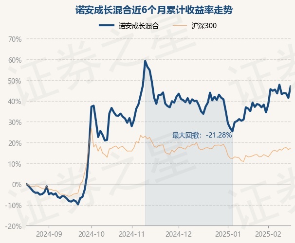 证券之星消息,2月19日,诺安成长混合最新单位净值为1.501元,累计净值为1.946元,较前一交易日上涨3.95%。历史数据显示该基金近1个月上涨5.63%,近3个月上涨2.88%,近6个月上涨47.01%,近1年上涨43.64%。该基金近6个月的累计收益率走势如下图: