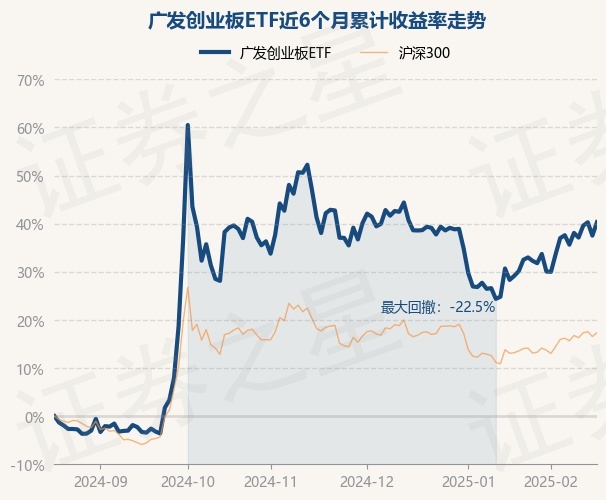 证券之星消息,2月19日,广发创业板ETF最新单位净值为1.3349元,累计净值为1.3349元,较前一交易日上涨2.03%。历史数据显示该基金近1个月上涨7.81%,近3个月下跌1.31%,近6个月上涨40.31%,近1年上涨29.15%。该基金近6个月的累计收益率走势如下图: