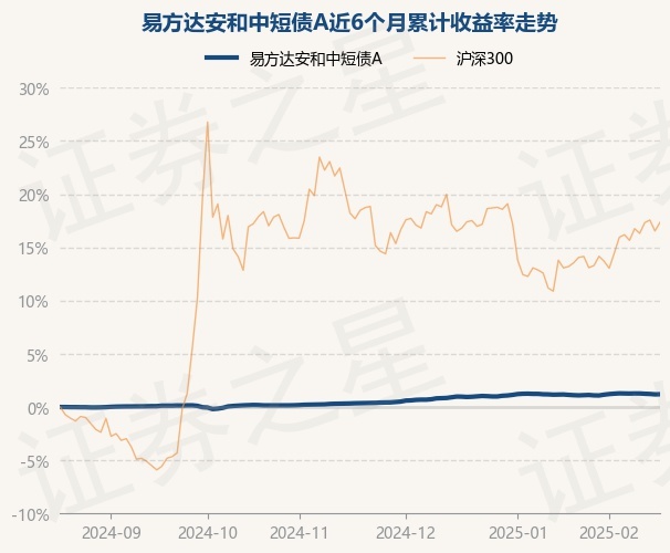 证券之星消息,2月19日,易方达安和中短债A最新单位净值为1.0688元,累计净值为1.1288元,较前一交易日上涨0.01%。历史数据显示该基金近1个月上涨0.08%,近3个月上涨0.83%,近6个月上涨1.2%,近1年上涨2.66%。该基金近6个月的累计收益率走势如下图: