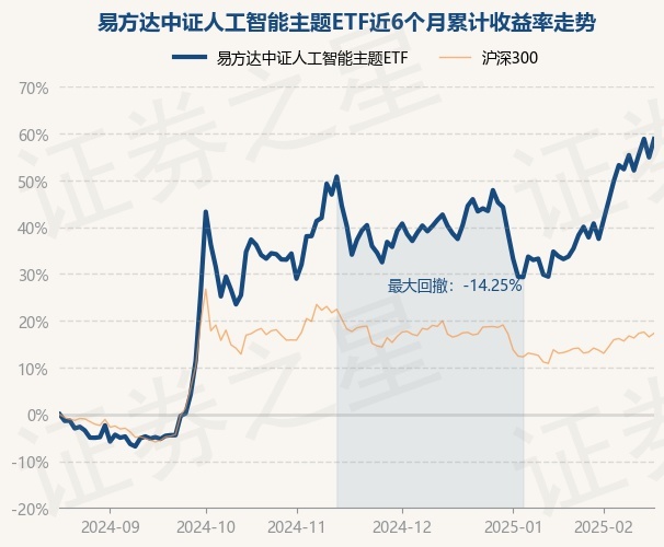 证券之星消息,2月19日,易方达中证人工智能主题ETF最新单位净值为1.0402元,累计净值为1.0402元,较前一交易日上涨2.53%。历史数据显示该基金近1个月上涨18.78%,近3个月上涨15.72%,近6个月上涨58.83%,近1年上涨51.46%。该基金近6个月的累计收益率走势如下图: