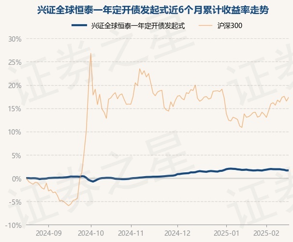 证券之星消息,2月19日,兴证全球恒泰一年定开债发起式最新单位净值为1.0167元,累计净值为1.0936元,较前一交易日上涨0.02%。历史数据显示该基金近1个月下跌0.03%,近3个月上涨1.35%,近6个月上涨1.67%,近1年上涨4.12%。该基金近6个月的累计收益率走势如下图: