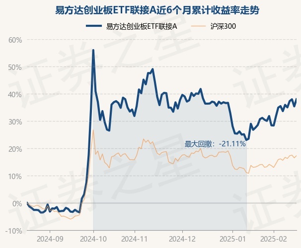 证券之星消息,2月19日,易方达创业板ETF联接A最新单位净值为2.2809元,累计净值为2.2809元,较前一交易日上涨1.93%。历史数据显示该基金近1个月上涨7.38%,近3个月下跌1.2%,近6个月上涨38.04%,近1年上涨27.29%。该基金近6个月的累计收益率走势如下图: