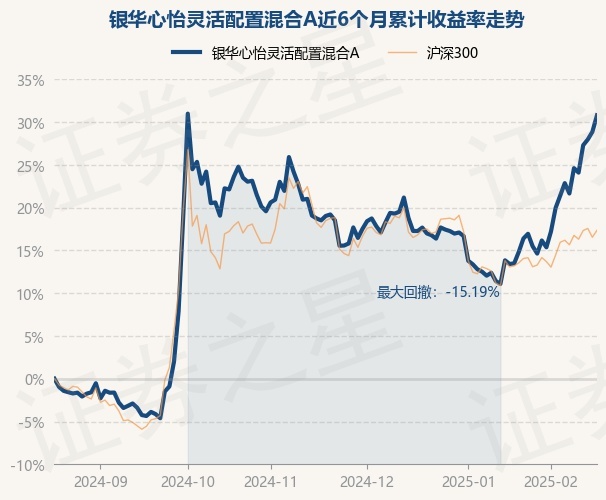 证券之星消息,2月19日,银华心怡灵活配置混合A最新单位净值为2.658元,累计净值为2.831元,较前一交易日上涨1.5%。历史数据显示该基金近1个月上涨13.89%,近3个月上涨9.88%,近6个月上涨30.79%,近1年上涨28.11%。该基金近6个月的累计收益率走势如下图: