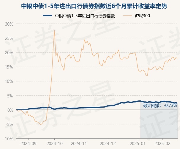 证券之星消息,2月20日,中银中债1-5年进出口行债券指数最新单位净值为1.047元,累计净值为1.0679元,较前一交易日下跌0.16%。历史数据显示该基金近1个月下跌0.28%,近3个月上涨1.48%,近6个月上涨2.26%,近1年上涨4.73%。该基金近6个月的累计收益率走势如下图: