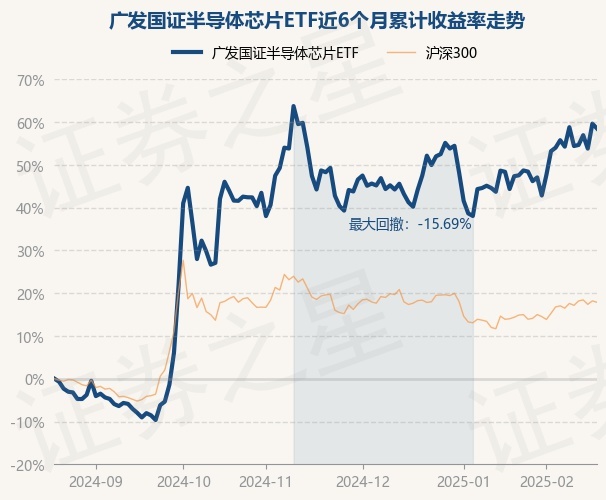 证券之星消息,2月20日,广发国证半导体芯片ETF最新单位净值为0.652元,累计净值为1.304元,较前一交易日下跌0.72%。历史数据显示该基金近1个月上涨7.41%,近3个月上涨6.89%,近6个月上涨58.48%,近1年上涨63.33%。该基金近6个月的累计收益率走势如下图: