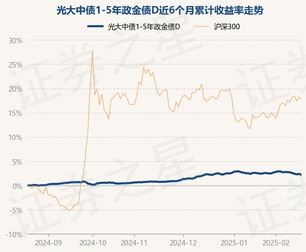 证券之星消息,2月20日,光大中债1-5年政金债D最新单位净值为1.0039元,累计净值为1.1164元,较前一交易日下跌0.18%。历史数据显示该基金近1个月下跌0.23%,近3个月上涨1.45%,近6个月上涨2.2%,近1年上涨4.65%。该基金近6个月的累计收益率走势如下图: