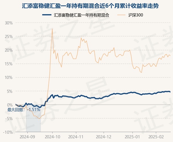 证券之星消息,2月20日,汇添富稳健汇盈一年持有期混合最新单位净值为0.9023元,累计净值为0.9523元,较前一交易日下跌0.21%。历史数据显示该基金近1个月上涨0.64%,近3个月上涨2.04%,近6个月上涨4.59%,近1年上涨4.29%。该基金近6个月的累计收益率走势如下图: