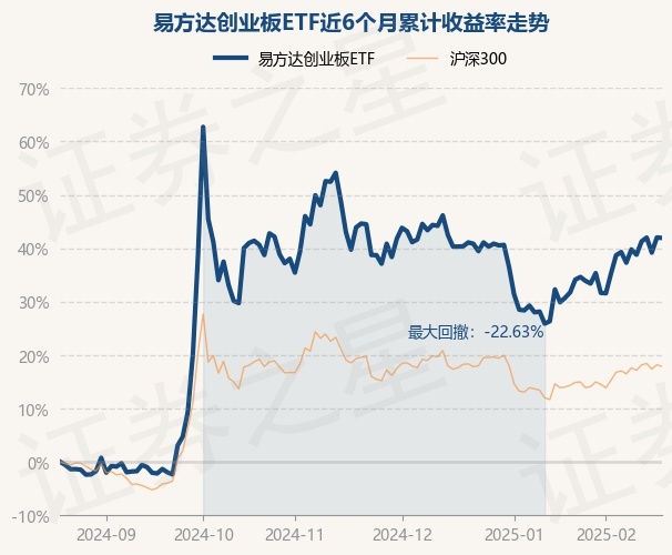 证券之星消息,2月20日,易方达创业板ETF最新单位净值为2.1834元,累计净值为2.5013元,较前一交易日下跌0.06%。历史数据显示该基金近1个月上涨5.81%,近3个月下跌1.87%,近6个月上涨41.93%,近1年上涨28.47%。该基金近6个月的累计收益率走势如下图: