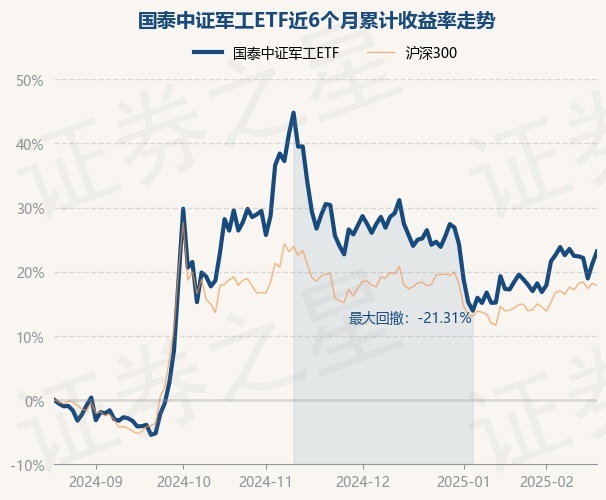 证券之星消息,2月20日,国泰中证军工ETF最新单位净值为1.0324元,累计净值为1.0324元,较前一交易日上涨1.56%。历史数据显示该基金近1个月上涨3.02%,近3个月下跌5.66%,近6个月上涨23.17%,近1年上涨24.4%。该基金近6个月的累计收益率走势如下图: