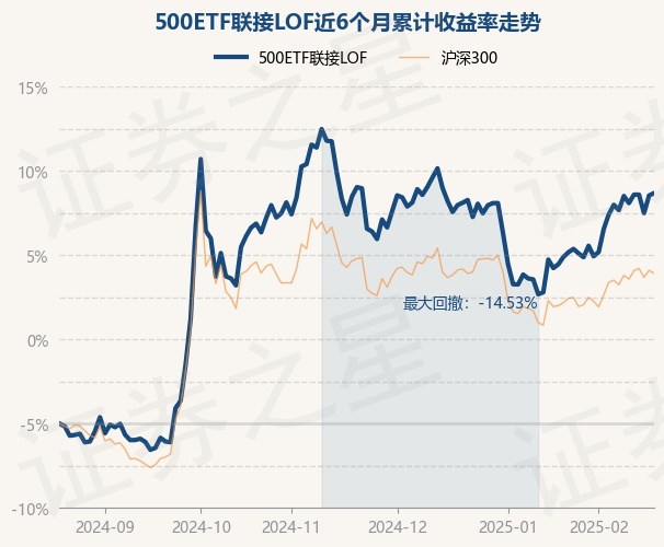 证券之星消息,2月20日,500ETF联接LOF最新单位净值为1.6641元,累计净值为1.7641元,较前一交易日上涨0.22%。历史数据显示该基金近1个月上涨5.83%,近3个月下跌0.56%,近6个月上涨27.37%,近1年上涨16.44%。该基金近6个月的累计收益率走势如下图: