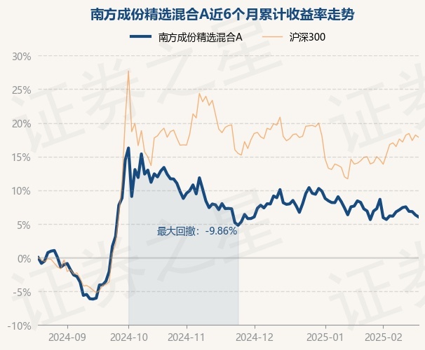 证券之星消息,2月20日,南方成份精选混合A最新单位净值为0.5806元,累计净值为1.9732元,较前一交易日下跌0.29%。历史数据显示该基金近1个月下跌1.12%,近3个月下跌1.19%,近6个月上涨6.03%,近1年上涨4.22%。该基金近6个月的累计收益率走势如下图: