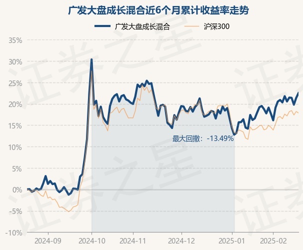 证券之星消息,2月20日,广发大盘成长混合最新单位净值为1.531元,累计净值为1.7024元,较前一交易日上涨0.92%。历史数据显示该基金近1个月上涨2.76%,近3个月上涨2.28%,近6个月上涨22.5%,近1年上涨14.41%。该基金近6个月的累计收益率走势如下图: