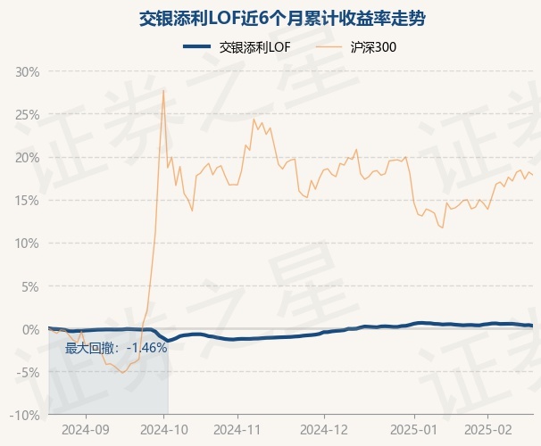 证券之星消息,2月20日,交银添利LOF最新单位净值为1.1045元,累计净值为1.8295元,较前一交易日下跌0.08%。历史数据显示该基金近1个月下跌0.05%,近3个月上涨1.31%,近6个月上涨0.3%,近1年上涨2.15%。该基金近6个月的累计收益率走势如下图: