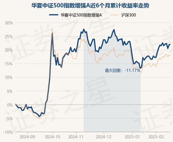 证券之星消息,2月20日,华夏中证500指数增强A最新单位净值为1.8661元,累计净值为1.8661元,较前一交易日上涨0.11%。历史数据显示该基金近1个月上涨3.59%,近3个月下跌1.53%,近6个月上涨22.01%,近1年上涨16.37%。该基金近6个月的累计收益率走势如下图:
