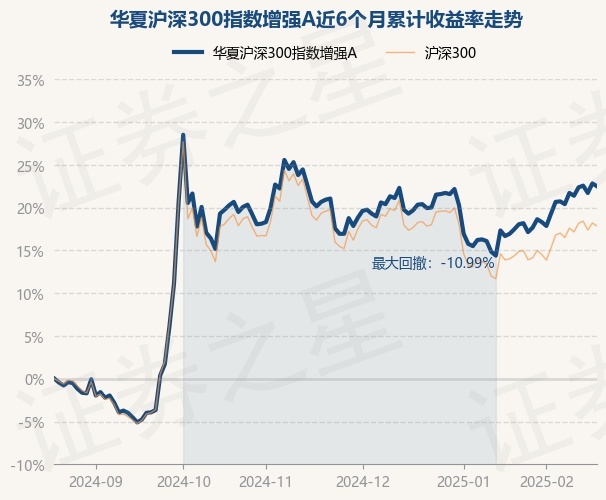 证券之星消息,2月20日,华夏沪深300指数增强A最新单位净值为1.873元,累计净值为1.873元,较前一交易日下跌0.27%。历史数据显示该基金近1个月上涨3.77%,近3个月上涨1.3%,近6个月上涨22.5%,近1年上涨23.63%。该基金近6个月的累计收益率走势如下图: