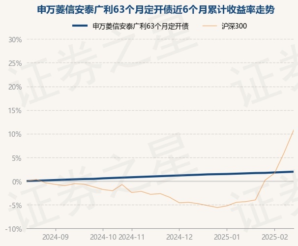 证券之星消息,2月21日,申万菱信安泰广利63个月定开债最新单位净值为1.061元,累计净值为1.164元,较前一交易日上涨0.08%。历史数据显示该基金近1个月上涨0.34%,近3个月上涨1.0%,近6个月上涨1.96%,近1年上涨3.96%。该基金近6个月的累计收益率走势如下图: