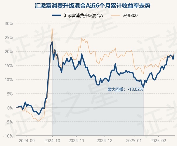 证券之星消息,2月21日,汇添富消费升级混合A最新单位净值为1.6995元,累计净值为1.6995元,较前一交易日上涨1.72%。历史数据显示该基金近1个月上涨6.14%,近3个月上涨7.39%,近6个月上涨19.19%,近1年上涨10.53%。该基金近6个月的累计收益率走势如下图: