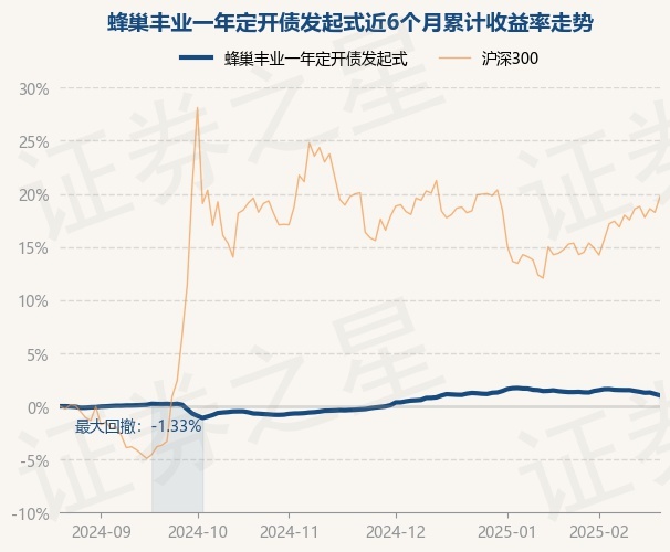 证券之星消息,2月21日,蜂巢丰业一年定开债发起式最新单位净值为1.0786元,累计净值为1.2127元,较前一交易日下跌0.14%。历史数据显示该基金近1个月下跌0.31%,近3个月上涨1.32%,近6个月上涨1.02%,近1年上涨6.73%。该基金近6个月的累计收益率走势如下图: