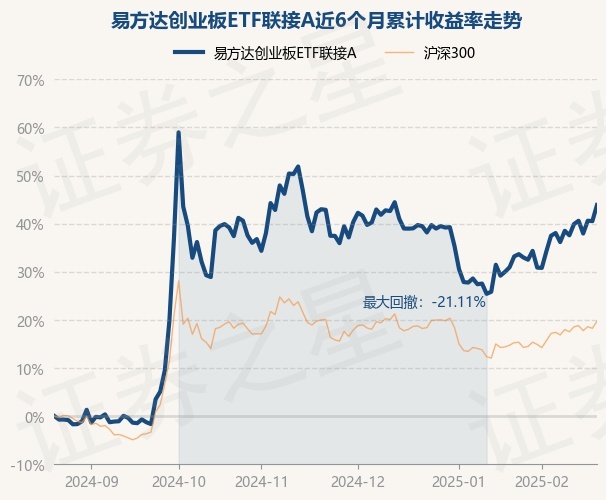 证券之星消息,2月21日,易方达创业板ETF联接A最新单位净值为2.3336元,累计净值为2.3336元,较前一交易日上涨2.38%。历史数据显示该基金近1个月上涨7.63%,近3个月上涨0.69%,近6个月上涨43.86%,近1年上涨29.81%。该基金近6个月的累计收益率走势如下图: