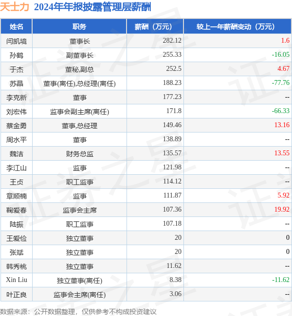 证券之星消息,天士力发布2024年年报,数据显示:公司主营收入84.98亿元,同比减2.03%。归母净利润为9.56亿元,同比减10.78%。扣非净利润为10.36亿元,同比减12.31%。当年公司员工总数10958人,同比增18.81%。人均薪酬17.8万元(注:"人均薪酬"根据定期报告中"应付职工薪酬"附注的本期增加值 / 员工总数计算而来),同比减15.24%。人均创收77.55万元,同比减17.54%。人均创利7.84万元,同比减28.88%。其中管理层薪酬总额为2376.7万元,同比上一年增30.91%,薪酬最高的为董事长闫凯境,薪酬282.12万元。