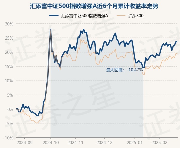 证券之星消息,2月24日,汇添富中证500指数增强A最新单位净值为1.6546元,累计净值为1.9196元,较前一交易日上涨0.08%。历史数据显示该基金近1个月上涨3.63%,近3个月上涨3.54%,近6个月上涨23.69%,近1年上涨18.94%。该基金近6个月的累计收益率走势如下图: