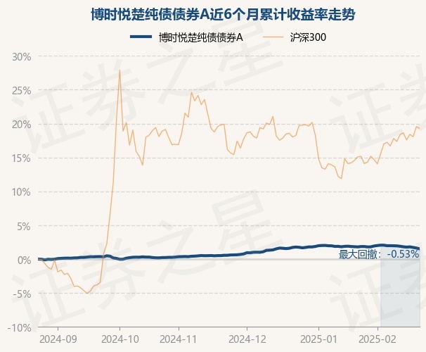 证券之星消息,2月24日,博时悦楚纯债债券A最新单位净值为1.067元,累计净值为1.257元,较前一交易日下跌0.12%。历史数据显示该基金近1个月下跌0.29%,近3个月上涨0.95%,近6个月上涨1.51%,近1年上涨3.63%。该基金近6个月的累计收益率走势如下图: