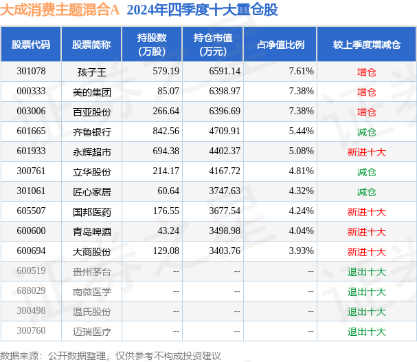 大成消费主题混合A为混合型-偏股基金,根据最新一期基金季报显示,该基金资产配置:股票占净值比86.27%,无债券类资产,现金占净值比15.77%。基金十大重仓股如下: