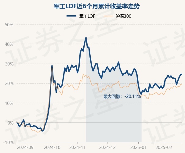 证券之星消息,2月24日,军工LOF最新单位净值为1.2541元,累计净值为0.8097元,较前一交易日上涨0.0%。历史数据显示该基金近1个月上涨5.31%,近3个月下跌0.33%,近6个月上涨24.87%,近1年上涨22.03%。该基金近6个月的累计收益率走势如下图: