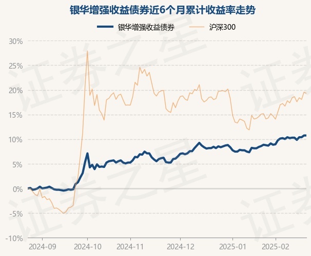 证券之星消息,2月24日,银华增强收益债券最新单位净值为1.233元,累计净值为1.968元,较前一交易日上涨0.0%。历史数据显示该基金近1个月上涨1.4%,近3个月上涨5.05%,近6个月上涨10.66%,近1年上涨10.56%。该基金近6个月的累计收益率走势如下图: