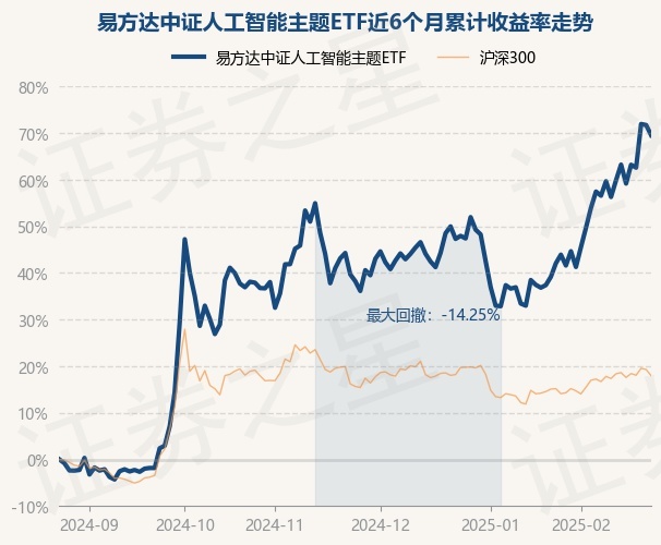 证券之星消息,2月24日,易方达中证人工智能主题ETF最新单位净值为1.0945元,累计净值为1.0945元,较前一交易日下跌0.13%。历史数据显示该基金近1个月上涨18.71%,近3个月上涨22.92%,近6个月上涨71.71%,近1年上涨56.11%。该基金近6个月的累计收益率走势如下图: