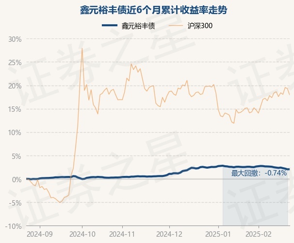 证券之星消息,2月24日,鑫元裕丰债最新单位净值为1.0959元,累计净值为1.1059元,较前一交易日下跌0.14%。历史数据显示该基金近1个月下跌0.45%,近3个月上涨1.49%,近6个月上涨2.05%,近1年上涨4.57%。该基金近6个月的累计收益率走势如下图: