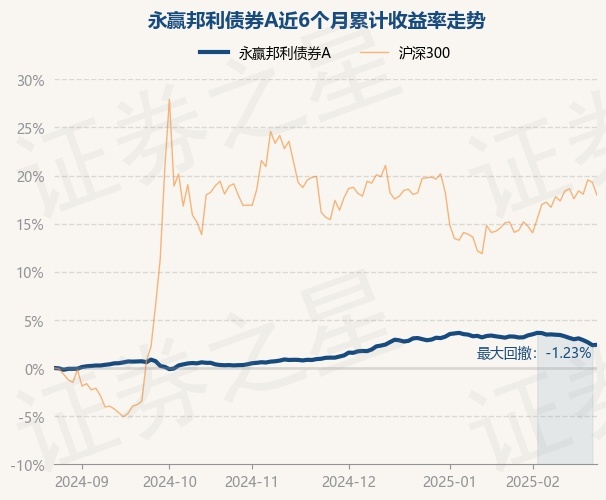 证券之星消息,2月24日,永赢邦利债券A最新单位净值为1.1134元,累计净值为1.1984元,较前一交易日下跌0.3%。历史数据显示该基金近1个月下跌0.79%,近3个月上涨1.39%,近6个月上涨2.37%,近1年上涨4.99%。该基金近6个月的累计收益率走势如下图: