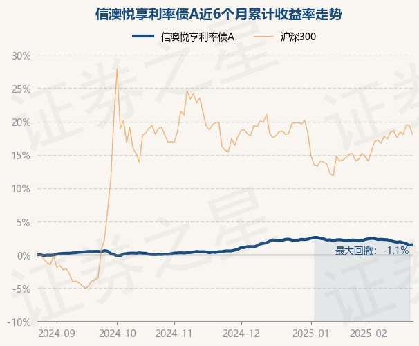 证券之星消息,2月24日,信澳悦享利率债A最新单位净值为1.0203元,累计净值为1.0455元,较前一交易日下跌0.19%。历史数据显示该基金近1个月下跌0.64%,近3个月上涨0.97%,近6个月上涨1.45%,近1年上涨3.41%。该基金近6个月的累计收益率走势如下图: