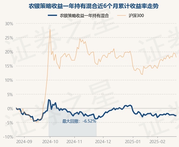 证券之星消息,2月24日,农银策略收益一年持有混合最新单位净值为0.6248元,累计净值为0.6248元,较前一交易日下跌0.33%。历史数据显示该基金近1个月下跌0.3%,近3个月上涨1.02%,近6个月下跌2.62%,近1年上涨2.11%。该基金近6个月的累计收益率走势如下图: