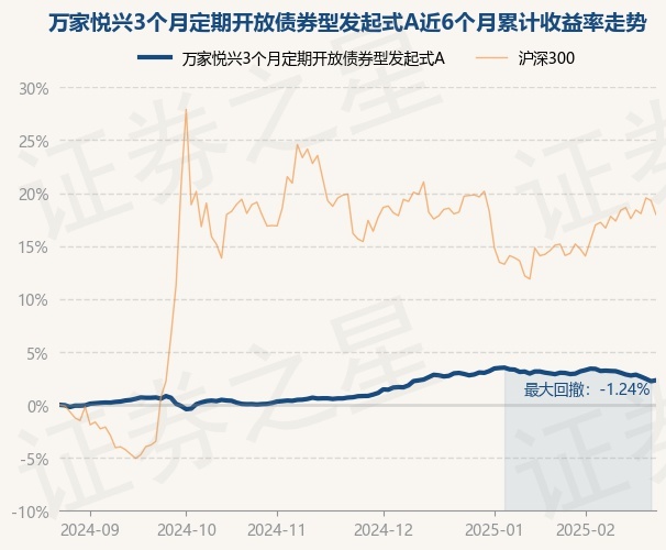 证券之星消息,2月24日,万家悦兴3个月定期开放债券型发起式A最新单位净值为1.045元,累计净值为1.1246元,较前一交易日下跌0.22%。历史数据显示该基金近1个月下跌0.69%,近3个月上涨1.51%,近6个月上涨2.23%,近1年上涨4.37%。该基金近6个月的累计收益率走势如下图: