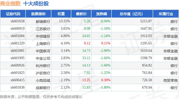 证券之星消息,2月25日,商业指数(000005)报收于2569.59点,跌1.1%,成交452.21亿元,换手率1.21%。当日该指数成份股中,上涨的有34家,中央商场以9.91%的涨幅领涨,下跌的有135家,金桥信息以7.8%的跌幅领跌。