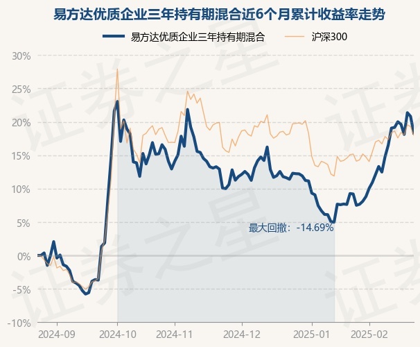 证券之星消息,2月25日,易方达优质企业三年持有期混合最新单位净值为0.9226元,累计净值为0.9226元,较前一交易日下跌2.06%。历史数据显示该基金近1个月上涨9.46%,近3个月上涨7.57%,近6个月上涨18.33%,近1年上涨12.42%。该基金近6个月的累计收益率走势如下图: