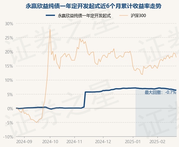 证券之星消息,2月25日,永赢欣益纯债一年定开发起式最新单位净值为1.0695元,累计净值为1.2193元,较前一交易日上涨0.0%。历史数据显示该基金近1个月下跌0.38%,近3个月上涨0.58%,近6个月上涨6.41%,近1年上涨8.82%。该基金近6个月的累计收益率走势如下图: