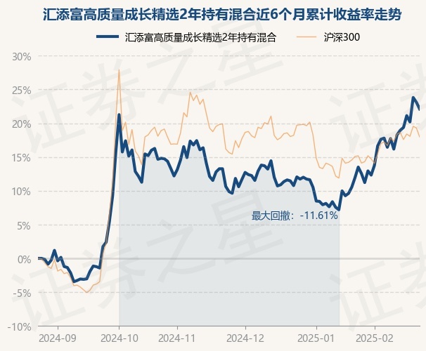 证券之星消息,2月25日,汇添富高质量成长精选2年持有混合最新单位净值为0.4954元,累计净值为0.4954元,较前一交易日下跌0.8%。历史数据显示该基金近1个月上涨8.12%,近3个月上涨11.13%,近6个月上涨22.11%,近1年上涨21.84%。该基金近6个月的累计收益率走势如下图: