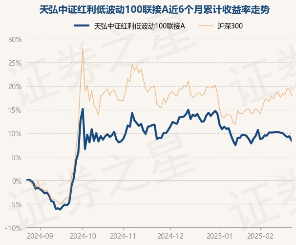 证券之星消息,2月25日,天弘中证红利低波动100联接A最新单位净值为1.6276元,累计净值为1.6276元,较前一交易日下跌0.85%。历史数据显示该基金近1个月下跌0.92%,近3个月下跌0.56%,近6个月上涨8.42%,近1年上涨5.17%。该基金近6个月的累计收益率走势如下图: