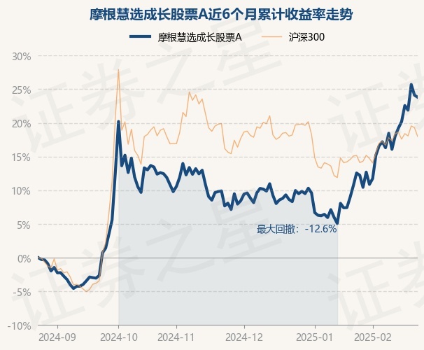证券之星消息,2月25日,摩根慧选成长股票A最新单位净值为1.2905元,累计净值为1.2905元,较前一交易日下跌0.26%。历史数据显示该基金近1个月上涨9.86%,近3个月上涨14.54%,近6个月上涨23.8%,近1年上涨25.38%。该基金近6个月的累计收益率走势如下图: