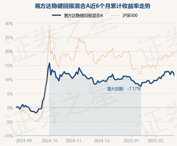 证券之星消息,2月25日,易方达稳健回报混合A最新单位净值为0.8691元,累计净值为0.8691元,较前一交易日下跌1.0%。历史数据显示该基金近1个月上涨2.21%,近3个月上涨2.93%,近6个月上涨11.39%,近1年上涨9.6%。该基金近6个月的累计收益率走势如下图: